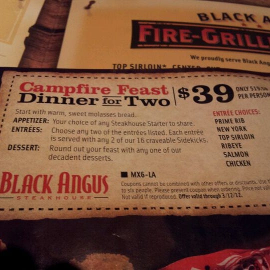 Campfire feast dinner for two for $39.99 at Black Angus with coupon ... Mar 25, 2014 - Stuart Anderson opened the first Black Angus Steakhouse location in 1964, and today there are 46 locations throughout California, New Mexico, Washington, Hawaii, Arizona, and Alaska.[1] [2] Black Angus coupons can save restaurant goers dollars off their next steak dinner. Printable Black Angus coupons are available online to members of the restaurant's Prime Club, or customers ...